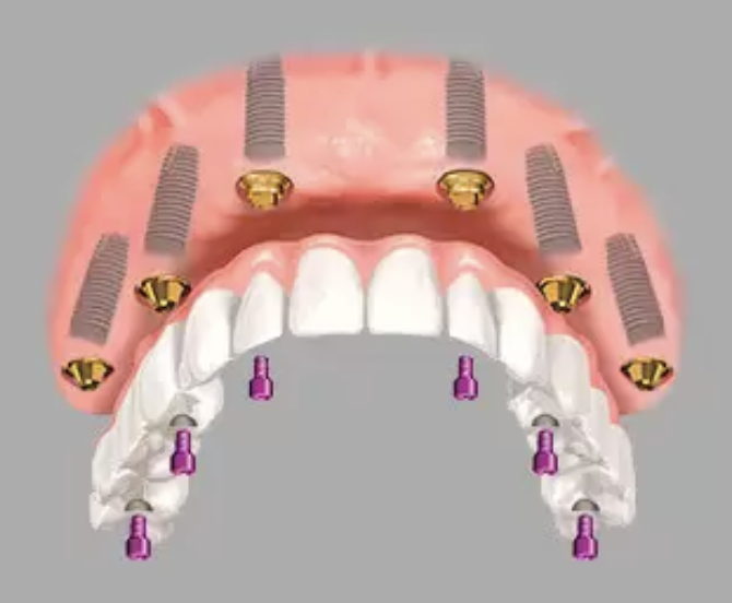 Имплантация на 6 имплантах - это улучшенная версия протокола метода на 4-х имплантах. Несьемный протез крепится на 6 титановых стержнях (два дополнительных вживляются по одному, в боковой отдел). За счет этого достигается высокая первичная стабильность.